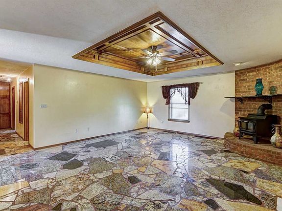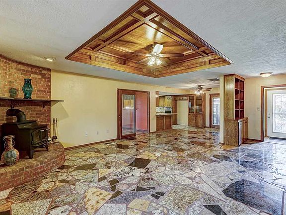 Very spacious home on a gated 3 acre tract with 2 large workshops, which have plumbing, and a storm cellar. This home also features a custom granite floor that is truly unforgettable.