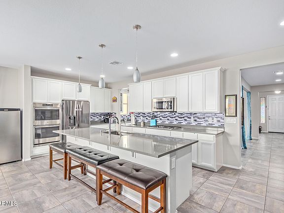 Solar is paid for! ($30K Value)Tired of high power bills in the summer? Want a $50 power bill? Come see this open layout showcasing high ceilings, recessed lighting, abundant natural light, tile flooring, & access to the backyard blending indoor-outdoor living seamlessly. The formal dining room is ideal for memorable gatherings. In the kitchen, you'll find cabinets w/ crown moulding, a butler's pantry, pendant lighting, quartz counters, SS appliances, & an island w/ a breakfast bar. The main bedroom offers plush carpeting & private bathroom w/ dual sinks & a separate tub for leisurely soaks. Relax in the backyard displaying a covered patio for alfresco dining, well-laid pavers, & a welcoming fire pit, ideal for gathering around w/ loved ones.