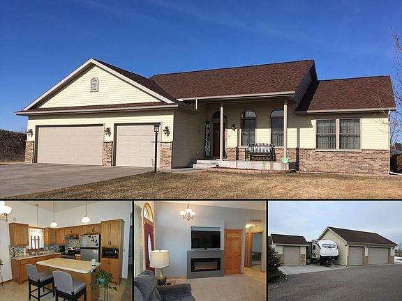 Impeccable rambler with 4 stall attached and 32' x 25'- heated/insulated detached garage/shop! Open floor plan with lots of natural light, updated kitchen with stainless steel appliances, main floor den with French doors & master bedroom with full private bath! The home also boasts 10' ceilings, a huge family room, main floor and lower level laundry, 6 panel doors and 2nd kitchenette/in-law suite in the lower level. Outside features include large maintenance free deck, front porch to watch sunsets, 3 year new roof & large patio with a professionally landscaped yard.