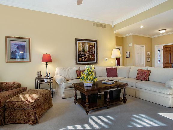 BUILT FOR COMFORT! And maintenance free. Storm door at covered entry. Foyer leads to 10.5' high ceilings in living room. Pleasing granite kitchen counters and breakfast bar. New refrigerator, dishwasher and sink. You will appreciate the new flooring throughout kitchen, dining room, entrance and hallway. Splendid crown molding in living room and beautiful tray ceiling in master. Convenient mudroom/laundry off garage and kitchen. Two full baths on main floor. Updated slate tile covering 3-way fireplace with view from living room, kitchen and dining area. Master Suite includes walk-in closet, double vanity, separate toilet and standup-shower. Full bath in hallway. New window treatments stay. Enjoy the outdoors with screened-in porch for warm gatherings. 30 x 16 brick patio is well-lit for cookouts and grilling at night. Lower lever has an extra room with full bath. Plenty of storage available plus room for expansion. Villa amenities include trimming of bushes, grass maintenance, irrigation and snow removal. Closed gate community with cameras. Furnace and A/C replaced within the last 4 years, gas hot water heater replaced in 2018. Garage exterior key pad. All measurements approximate.