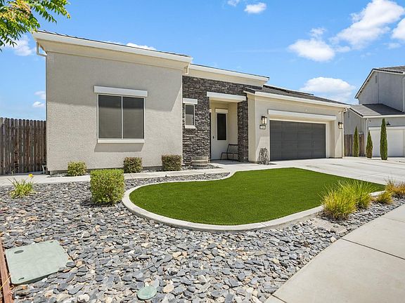 Welcome to 1204 Nabih Hamdan a beautifully designed modern home with two spacious primary suites (one upstairs & one downstairs), perfect for multi-generational living or private guest space. Inside, warm wide-plank wood floors, soaring ceilings, and abundant natural light create an inviting feel. The chef's kitchen features crisp white cabinetry, quartz counters, stainless appliances, a 5-burner gas cooktop, and an oversized island with seating, opening to the dining area and great room for seamless entertaining. The downstairs primary suite offers convenience and privacy, while the upstairs suite includes a spa-inspired bath with dual sinks and matte black fixtures. A huge loft provides flexible living media, play, or gym plus a dedicated office/flex area for work or study. Outside, enjoy a low-maintenance backyard with a large patio, lush greenery, and space for BBQs or relaxing. The front yard features modern turf and rock landscaping for year-round curb appeal. Additional highlights include a laundry room with built-in cabinetry, stylish light fixtures, and an oversized two-car garage. Located in a quiet newer Manteca neighborhood near shopping, dining, schools, and commuter routes, this home perfectly blends modern style, comfort, and versatility.
