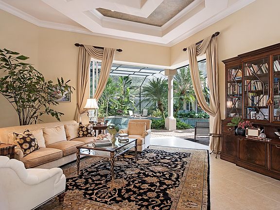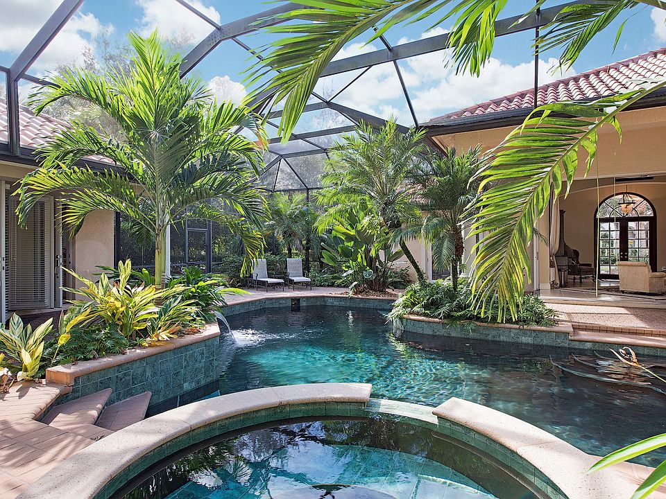 A tropical oasis in the heart of North Naples awaits at this sophisticated courtyard residence in Collier's Reserve, just minutes to Vanderbilt Beach, Mercato, Waterside Shops, or the Center for the Arts. Situated on an over half acre property, the open plan single-story custom home flows seamlessly indoors and out, from casual elegant to light and bright comfort spaces. Disappearing 90-degree sliding glass doors invite the outdoors in, with waterfalls cascading into the large lagoon pool and lush foliage embracing the tiered poolscape. Imagine yourself entertaining in tropical style or relaxing in the privacy of your Florida oasis. A spacious guest house with morning bar makes family and friends feel at home instantly. Exquisite designer finishes are highlighted by high ceilings with creative detailing and rich crown molding. For the golf enthusiast, the double car garage extends to a third bay for golf cart parking. In walking distance to tennis & fitness center, golf range, kayak launch, fishing pier ... this is Naples living at its best!