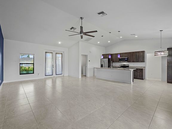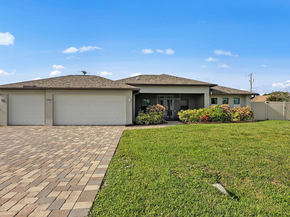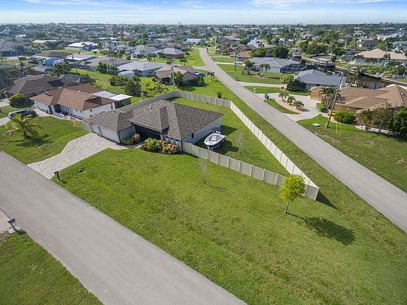Built in 2018 featuring an open floor plan offering exceptional features with all impact windows/doors, new roof in 2023, no flood insurance required and situated on an over-sized corner lot. Located near Downtown Cape Coral and tucked just off Del Prado you will find this exceptional Beattie Development home. Upon entering the home you’re greeted by vaulted ceilings in the expansive great room. The kitchen consists of an endless granite kitchen island, soft closing all-wood cabinets and stainless-steel appliances. The split bedroom plan has wonderfully sized guest rooms offering privacy and comfort. The primary bedroom has an abundance of leisure space providing ultimate comfort. The primary also boasts two walk-in closets, an enormous primary bath with two sinks, granite counter tops, large walk-in shower and abundant natural light. Dual panel slider doors open from the great room to the large screened lanai area finished with stylish pavers. That backyard has abundant space for a future addition of a pool with Southern rear exposure. The three-car garage offers a plethora of storage for all your vehicles and toys.