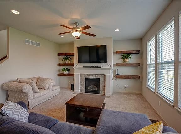 Enjoy your coffee on the FRONT PORCH. This stunning 2-story features generous, flowing spaces. A DEN/BONUS ROOM is located just off cathedral entry. A 15X16 great room and a 10X16 dining kitchen area featuring GRANITE countertops and walk-in PANTRY. OPEN & RELAXED. You won't have to walk around the bicycles with this EXTRA-SPACIOUS GARAGE adjoined by MUDROOM w/2 CLOSETS and cute BUILT-IN w/coat & boot bench. Everyone gets their own play/workspace with a second-floor LOFT ROOM. 14X15 Master suite w/WALK-IN CLOSET. All custom blinds throughout. Upgraded front-stone turnbacks and stone-based pillars. This is one of the larger plans in kensington Farms!