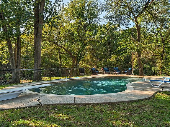 One acre lot with large, mature trees. Over 3000 square feet in the main house with 4 beds, 3 full bathrooms, and one half bath. Master downstairs with other bedrooms upstairs. Huge master suite including a study/gym/nursery and a laundry room attached to the master closet! Kitchen with gas range, double ovens, farm sink, and undercounter ice maker. Formal dining with wood floors plus eat-in kitchen. Two living areas downstairs. Upstairs has 3 bedrooms and 2 full baths. Wonderful outdoor entertaining area with a heated saltwater pool with sundeck and diving board and huge patio with cooldecking that stays nice and cool in hot summer months. Home also has a detached shop and 1 bedroom efficiency apartment. Brand new heat and air in the shop and apartment. Great for mother-in-law or college kid. Home is in a culdesac in a quiet neighborhood with creek running behind the house. New 2000Sq ft Shop