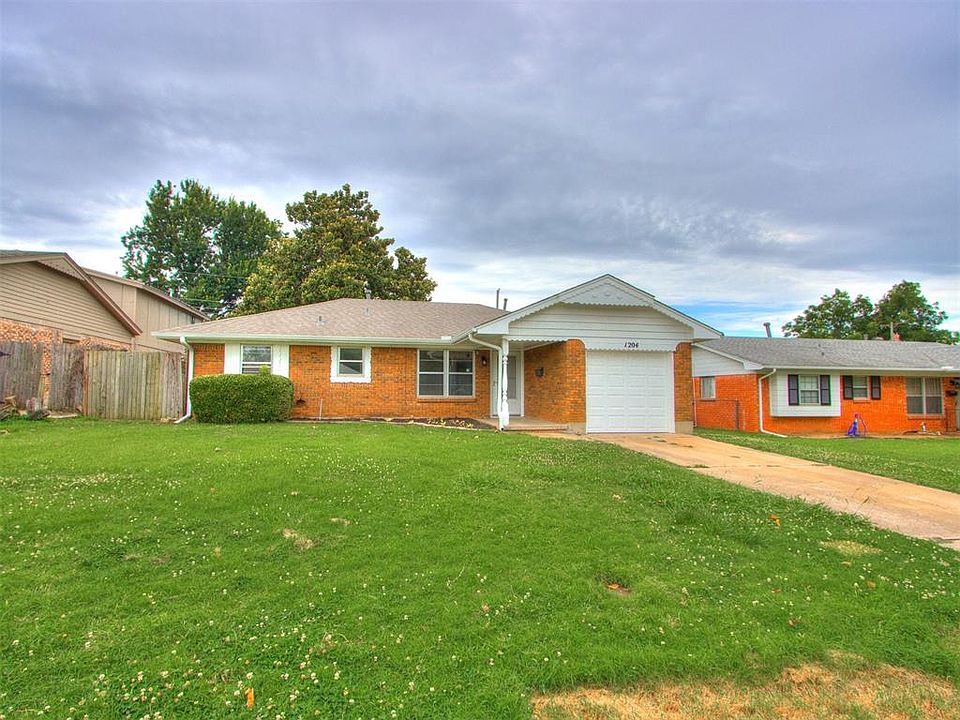 This beautifully remodeled home at 1204 W Woodlane Dr is move-in ready with fresh, modern finishes throughout! From the curb, you’ll notice the clean exterior and a spacious front yard, but step inside and you’ll be greeted with brand-new flooring, neutral paint, and tons of natural light. ** Small Butcher-block Piece in kitchen will be installed within the next week** The kitchen and both bathrooms have been completely updated—featuring sleek black fixtures, marble-style tile, and plenty of cabinet space. The main bath includes a vanity and walk-in shower that looks straight out of a magazine. All the bedrooms are bright and airy with new ceiling fans and flooring, and the layout offers a nice flow for everyday living. Out back, you’ve got a large yard with mature trees and room to relax or play. Tucked in an established neighborhood just minutes from Tinker AFB, shopping, and dining, this home has all the updates without the new-construction price tag. Come check it out and make it yours!Seller is a licensed agent.