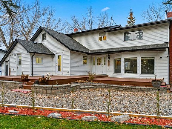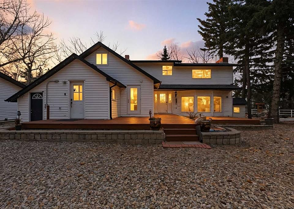 A Private Country Oasis on 5.52 Acres | Steps to Town | 2,231 Sq. Ft. Above Grade | Over 3,000 Sq. Ft. of Total Developed Living Space Discover this exceptional acreage property offering privacy, natural beauty, and timeless country charm — all just minutes from town amenities. Nestled on 5.52 fully treed acres behind a private gated entrance, this uniquely designed residence provides a serene lifestyle while maintaining convenient access to daily necessities and major roadways. The home features thoughtfully selected farmhouse-inspired finishes, including reclaimed elements sourced from historic sites. The well-appointed kitchen includes stainless steel appliances, ample counter space, and extensive cabinetry, providing both functionality and style. The adjoining dining room offers a warm and inviting space for family gatherings and special occasions. A dramatic, light-filled family room showcases vaulted ceilings and expansive windows framing the peaceful natural surroundings. The sunken living room adds an additional cozy retreat, complete with a wood-burning fireplace and bay window — ideal for relaxing on cooler evenings. The upper level hosts a charming primary bedroom with double barn-door closet access, a gas fireplace, and a private balcony overlooking the treed landscape — the perfect spot for morning coffee or quiet reflection. A second bedroom, flex room, and spacious 5-piece bathroom complete this level. The finished lower level offers a large multi-purpose space, an additional bedroom with 2-piece bathroom (macerating toilet), and direct walk-up access to the outdoors.The fully developed lower level offers exceptional additional living space, featuring a bedroom, a 2-piece bathroom (macerating toilet), a large recreation room, storage area, and direct walk-up access to the outdoors, making it ideal for guests, teens, or multi-use living. Outdoor Features The property offers endless opportunities to explore and enjoy nature with mature trees, walking paths, and multiple outdoor activity and relaxation areas. Additional amenities include: • Cottage-style playhouse • Swings and outhouse • Chicken coop and horse shelters • Wood sheds and detached garage • Two firepit areas and water features • Expansive deck space • Pasture and stock waterers — ideal for horse owners Recent Upgrades • Gas stove • Window blinds • Water filtration system • New hot water tank • New furnace Location & Investment Appeal Conveniently located near Honda Okotoks, this property offers excellent access to shopping, services, and commuter routes. A fantastic opportunity for buyers seeking space, lifestyle, and long-term land value in the Okotoks and surrounding area. This one-of-a-kind property combines character, comfort, and possibility — a rare offering that truly must be experienced.