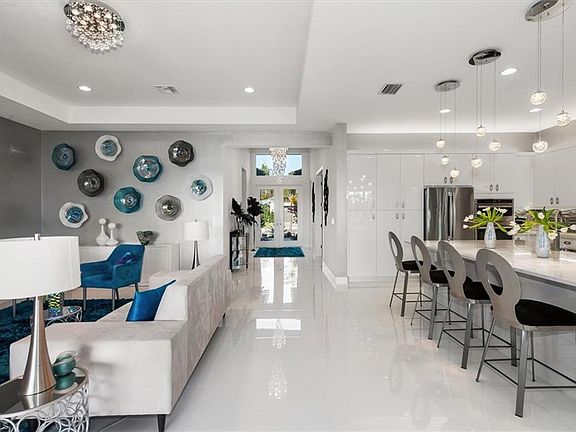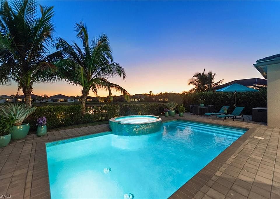 SHOWS LIKE A MODEL! This gorgeous Sunrise model is located on a beautiful southern exposure lake lot, giving you lots of sun all year on the pool and spa along with spectacular sunset views. Fully landscaped with 8' Clusia hedges providing an oasis-like tropical paradise. Interior upgrades include Eurocraft acrylic overlay cabinets (kitchen, primary bath, powder room and den); soft close doors and pull-out shelves in kitchen under the stovetop; 33"x33" white polished porcelain tiles in kitchen, main living area, den and hallways; custom lighting and extra recessed lighting; hanging cabinets in living room, den and bedroom 3; central vacuum system; upgraded GE Profile appliance package, including 5-burner stove and cabinet-flush refrigerator; upgraded Moen kitchen faucet and single kitchen bowl; hooded vent over range; upgraded door pulls on cabinets; glass tile backsplash; upgraded carpet and padding in bedrooms; glass front double doors. Exterior upgrades include premium lake lot; heated pool and 8-seat spa with 9' spillway with super pump to push water over the edge of the waterfall; custom outdoor kitchen with two refrigerators, gas grill, large sink, pull-out trash receptacle and lots of counter space; retractable REMOTE CONTROLLED no-see-um screens to keep the bugs out; lanai fans; TV outlet; upgraded pavers; upgraded landscaping back and front...and more. Minutes from restaurants and shopping. This is your opportunity to enjoy the Naples lifestyle in the highly sought after fun and active Valencia Trails community.
