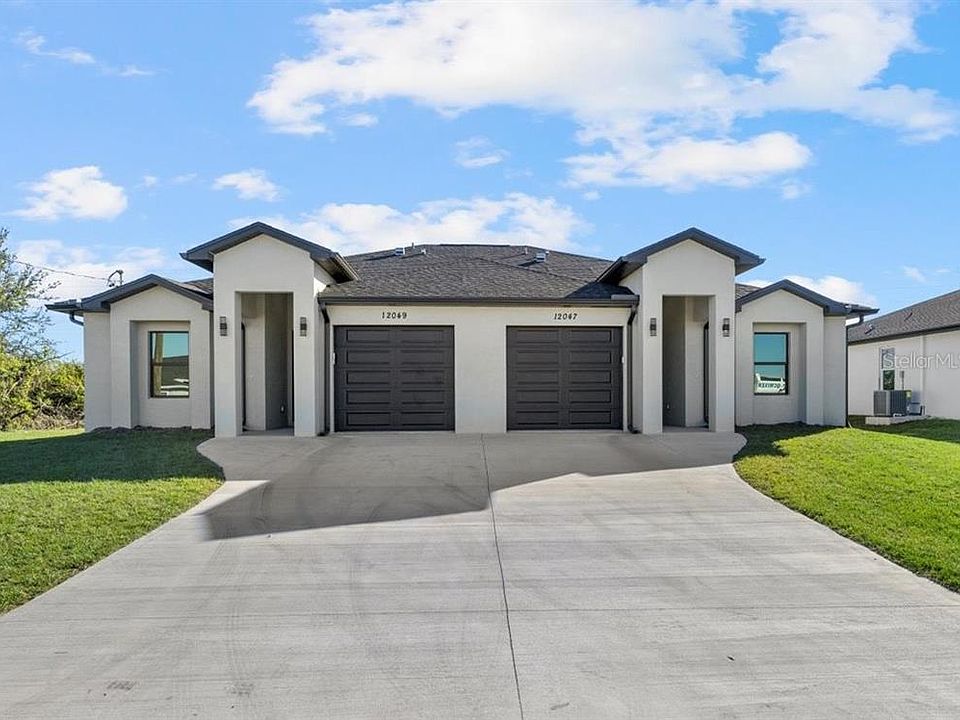 Introducing a newly built duplex that combines modern design with premium features. This property boasts an extra-wide driveway, a covered lanai, and impact-resistant windows for added durability and peace of mind. Enjoy the convenience of city water, vaulted ceilings in the living room, and a spacious garage with ample storage. The backyard features Areca palm trees along the rear perimeter, providing enhanced privacy and noise reduction. With meticulous attention to detail throughout, this property offers a unique opportunity for homeowners and investors alike. An identical duplex next door is also available for purchase (MLS #:N6136035), making it an excellent option for generating rental income or expanding your investment portfolio. Don’t miss out—schedule your showing today!