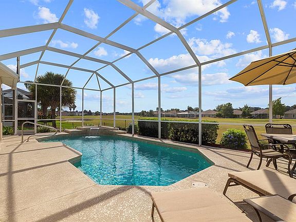 Located in the exclusive 55+ Gated Golf Community of STONECREST adjacent to THE VILLAGES, FL! One step through the threshold and you're SOLD! The owner has exquisite taste and it shows! This is not your average KINGSLEY Floor plan! Living room expanded 3 feet which enlarged the 2nd bdrm, dining room & laundry room!10' Ceilings throughout! 2 bedroom plus DEN w/French doors. LG SS appliances. TILE floors on diagonal w/carpet in bedrooms! Large Master bedroom with oversized walk in closet are just a few of the extras! SALT WATER POOL w/ 2 speed pump, Heat pump and 4 filters on the 8th Fairway of the GOLF COURSE! If you've been dreaming of owning a home with a pool... look no further!