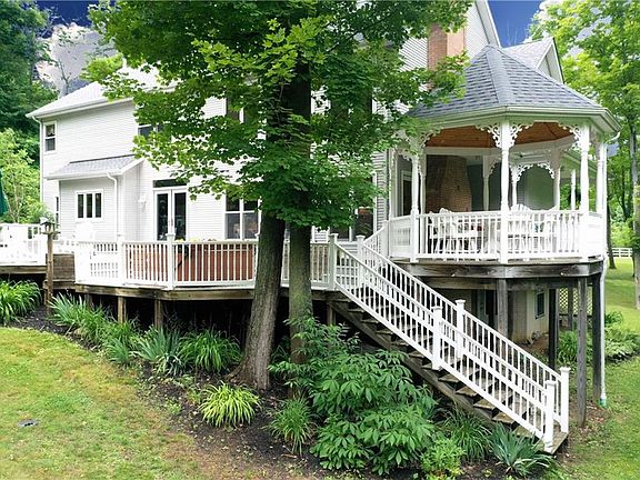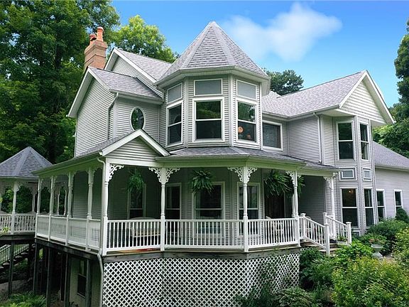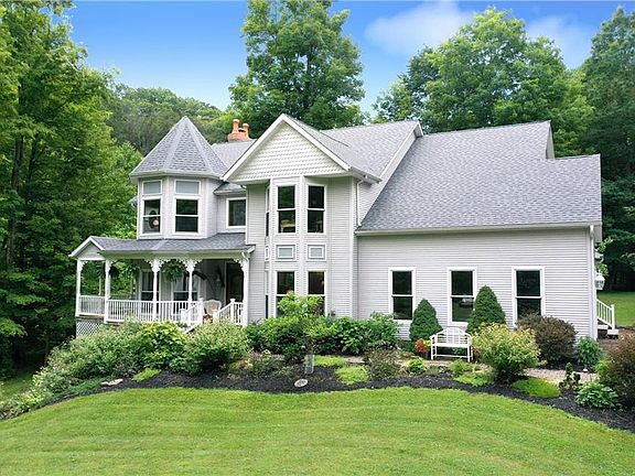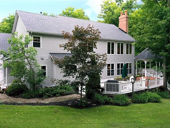Custom quality-built Victorian-Style Colonial is set back from road on 5+private wooded acres! This one-owner home offers over 3000 sqft of living space with 4 Bedrooms and 3.5 Baths. 2-story Foyer welcomes you with leaded glass double doors and beech hardwood floors through to Great Room with wall of windows and stunning wood burning fireplace. Gourmet Kitchen with cherry cabinets, center island, farm sink, walk-in pantry, custom built-in cabinet with desk in dining area and french doors to back deck. Formal Dining Room with transom doors and large bay window. Designed with smaller Master Bedroom on 1st floor with private full bath plus large Second floor Master Bedroom Suite and Master Glamour Bath includes double sink granite vanity, marble floors, oversized tiled shower & jetted tub plus huge walk-in closet/dressing area with built-in makeup counter. 2nd floor also includes 2 additional bedrooms with walk-in closets, shared full bath and Laundry Room. Walk-out unfinished basement has 9 ft ceilings is plumbed for bath and wet bar. New Roof installed in 2019. Enjoy peaceful secluded setting from wrap around covered porch, 3-tiered cedar deck and gazebo overlooking backyard with mature trees, creek and stocked pond with dock. Paved driveway, 10x14 storage shed, 2-car attached garage plus 30x40 heated outbuilding/garage will hold additional 4 cars and ideal for hobbyist or home business! Chardon Schools.
