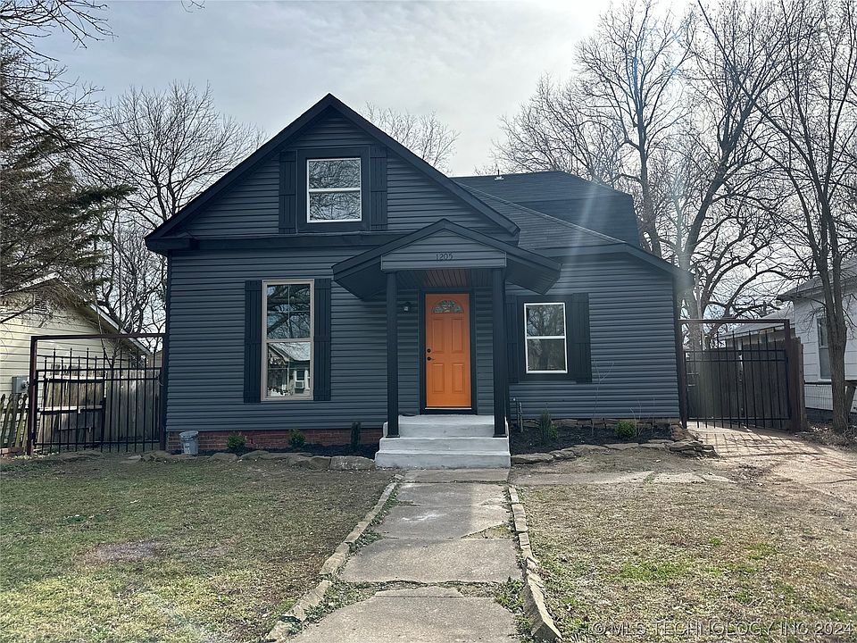 Enjoy elevated style in this gorgeous remodeled 1930s bungalow. Everything you see and can't see is new! From the plumbing, wiring, roof, and siding-- to doors, custom cabinetry, kitchen and baths. The kitchen features a built-in range, soft-close cabinets, farmhouse sink and granite countertops & backsplash. Huge walk-in pantry with sliding door, a recessed area for your fridge and an additional wall cabinet for extra pantry space/storage. The living room has coffered ceilings and a built-in cabinet with recessed wall perfectly set up to hang a huge TV or art. The primary bedroom is downstairs and features a walk-in closet that will make you swoon! Tons of built-in drawers and storage that you would usually see in a house at twice the price plus tons of natural light. That closet leads into the laundry room (which is also accessible off the kitchen) and bath with striking walk-in shower. The black and white tile is both on-trend and timeless. Upstairs, you'll find two more bedrooms with nice-sized closets, a full bath and extra walk-in attic space for storage that is floored, sheet rocked and trimmed, The back patio is huge, perfect for barbecues and lounging, and overlooks a large fenced backyard with a metal storage building complete with concrete floor. There's nothing to do but move in!