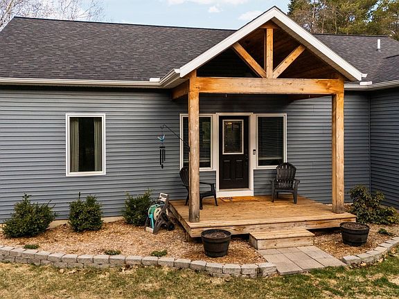 Tucked away in the heart of Long Lake Township, this newer ranch-style home offers peaceful living on 4.78 wooded acres surrounded by towering hardwoods and pines. With 4 bedrooms and 2 baths, this property features an open layout with cathedral ceilings, a cozy gas fireplace, and a light-filled great room that flows seamlessly into the kitchen. The kitchen is a standout with its butcher block island, ample counter space, and warm, welcoming vibe—perfect for entertaining. Beautiful hardwood floors run throughout the main level, adding to the home's natural charm. The finished walkout basement provides additional living space and is already plumbed for a third bathroom, offering room to grow. Step outside to enjoy the covered porch and the peaceful country setting that makes this property feel like a retreat. A two-car garage rounds out the package. Enjoy quiet, comfortable living just a short drive from all the amenities of Traverse City.
