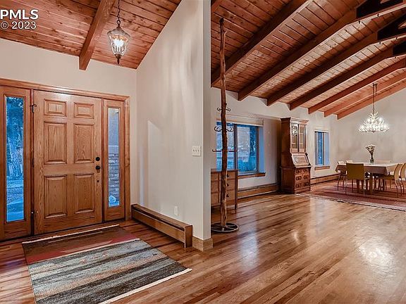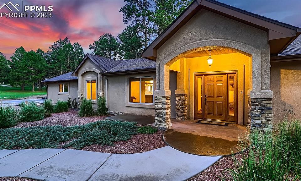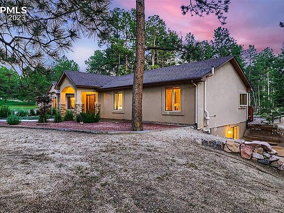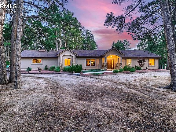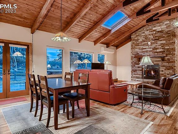 This stunning 4-bedroom, 3-bath retreat offers an incredible blend of comfort, serenity, & natural beauty. Nestled on just under an acre of wooded privacy in Woodmoor, this home boasts main level living & views of Pikes Peak. Drive up the long drive (seller is leaving the JD tractor mower w/ plow for snowy days) to the oversized finished garage or circular drive for ample parking. Step into the home, to be greeted by beautiful hard wood floors, vaulted tongue and groove ceilings with exposed beams & large windows/skylights that flood the space with natural light. The open floor plan connects the living, dining, and kitchen areas, creating an ideal space for entertaining. The floor to ceiling stone fireplace makes a gorgeous and cozy focal point in the living area. The kitchen features modern stainless appliances, ample granite countertops, an island, walnut cabinets & pull outs. Adjacent to the kitchen is a cozy dining area, & the laundry (mud) room + pantry is located between the kitchen & finished over sized garage. An a/c mini split system in both the living area and Primary bedroom offer relief on hot days. The main level also hosts the large primary suite with its spacious layout, plush carpeting (wood beneath), + large windows & walks out to a wood deck over looking the beautiful backyard. The en-suite bath is beautifully appointed featuring a spa shower, double sinks, granite counters, heated floors & large walk in closet. 2 additional bedrooms + a full bath on the main level offer flexibility. The basement provides additional living and storage space as well as another bedroom & bath. Step outside onto the patio, where you'll enjoy the mature pine trees and landscaping creating a sense of seclusion and privacy, allowing you to fully unwind and appreciate the tranquility of the setting. And that Pikes Peak view! *HOA provides drive by security when you're away. Don't miss the opportunity to make this extraordinary home your own!