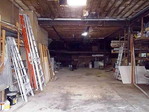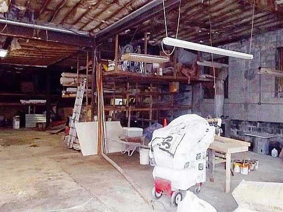 Two (2) five year old furnaces plus wood burner, eight year old rubber roof, auto open 14'x11' drive thru door, 3 phase electric, all Romex, concrete and block construction with concrete floor, 100' x 100' fenced yard, security system (inop).