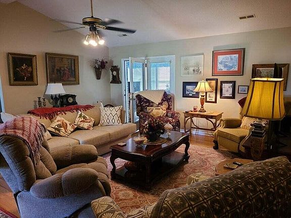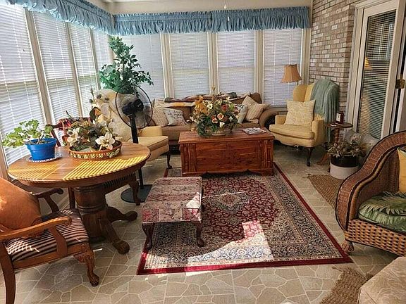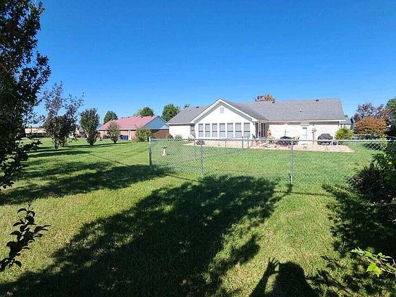 Brick home boasts of 1996 sq ft with 3 bedrooms & 2 full bathrooms renovated in 2022. Includes newer hardwood & cathedral ceiling in great room. Open floor plan extends to your sunroom. All appliances stay in kitchen with a bar area. Newer chain link fencing, patio and storage building- located minutes from Lee's Ford Marina.