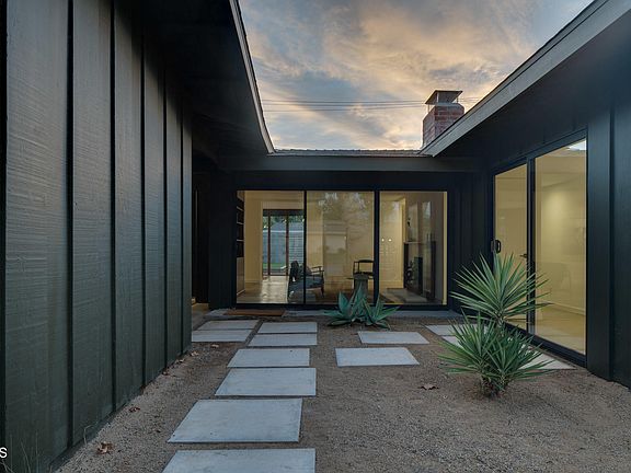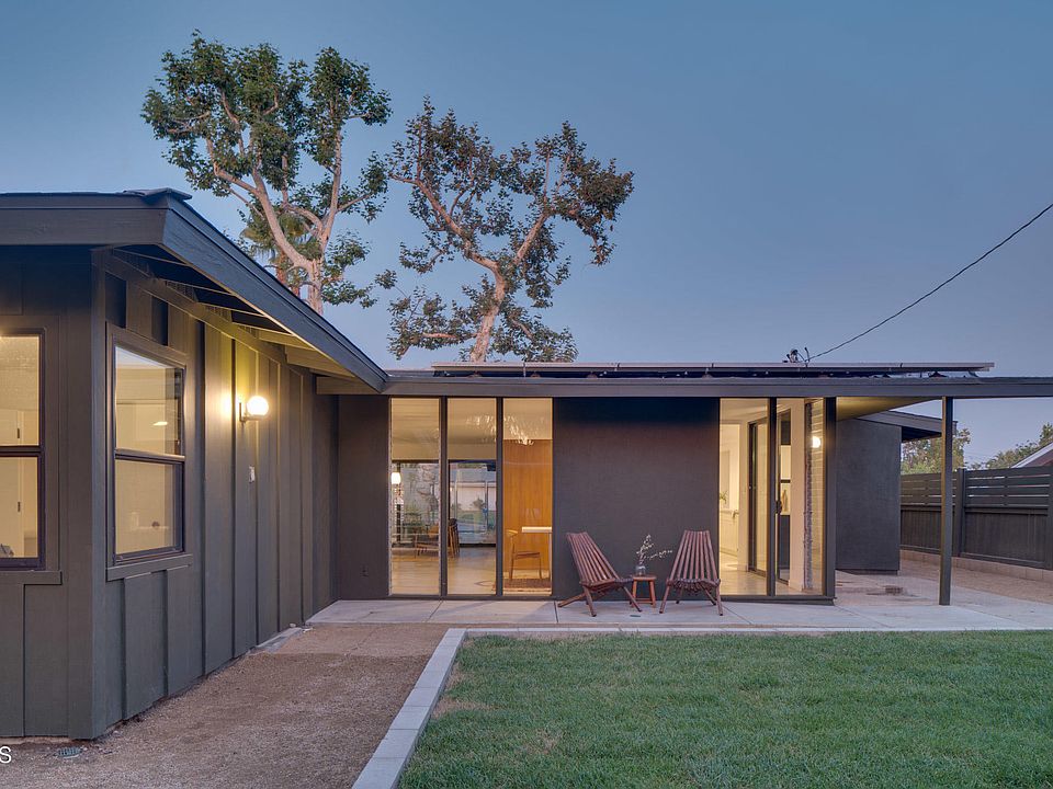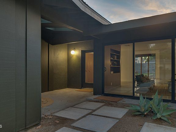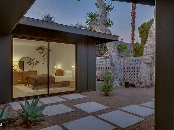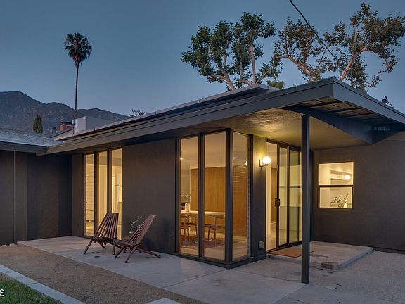 Nestled in an enclave designed by prolific architect, Edward H. Fickett, FAIA, this sleek mid-century refuge exudes minimalist chic. Its sleek lines and distinctly modern use of space invite you to take a deep breath as soon as you enter its doors. Many original details remain and meld seamlessly into the current adaptation. Chat with friends while prepping charcuterie in the galley kitchen. Equipped with Bertazzoni appliances, two sink stations and an oversized pantry, the kitchen fuses high design with functionality. The dining room displays original wood paneling and hidden storage while floor to ceiling windows cast a romantic backdrop for intimate dinner parties. The main bedroom is a true sanctuary with double shower and customizable space, perfect for a dreamy walk-in closet, nursery or Peleton room. Two additional rooms flank the spacious family room complete with beverage bar. Fully paid solar panels offer a significant energy savings. Revel in glorious sunsets with mountain views and relax in the shade of mature orange and fig trees. 5 minutes from Hastings Village and blocks from beloved Hamilton Park and Don Benito School.