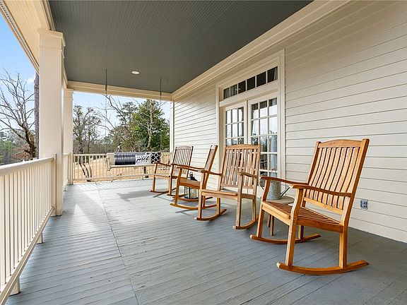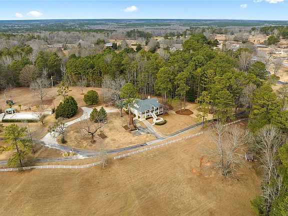 Nestled on almost 8 acres of picturesque land, this remarkable residence is a true gem. Boasting a captivating wrap-around porch that offers stunning views of the property, this home is a unique find. The kitchen is a chef's dream. It showcases a magnificent waterfall island, two sinks, a double oven, a gas stove with a sleek hood, custom cabinetry, and a view of the backyard oasis with its inviting pool. The living room features updated light fixtures, built-in shelving and a double-sided fireplace. The primary bedroom features 10-foot ceilings, views of the grounds, and an updated bathroom complete with dual vanities and custom shelving in the closet. Upstairs, discover 3 bedrooms and a bonus room that can easily double as a home office, accented by a charming brick wall. The basement level offers a spacious room that could also serve as a den, adding even more versatility to this magnificent home. The attention to detail throughout this home is truly breathtaking.