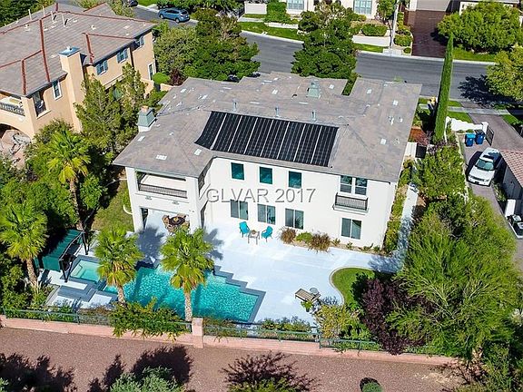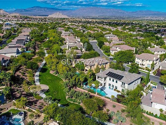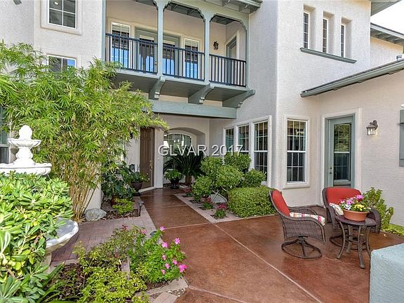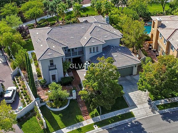 Award winning Christopher Home in the prestigious, guard gated community of the Vineyards. One of the larger lots in the neighborhood, the home backs to the Summerlin trail system. Elementary children can get safely to school without traffic on trail. MS & HS also close by. Freshly painted inside and out. Spacious courtyard boasts fountain & fireplace. Backyard oasis includes pool w/waterfall,spa,pergola, & covered patio. Bright,open floor plan.