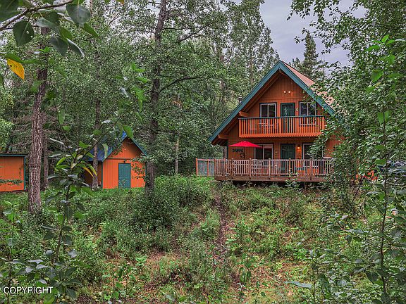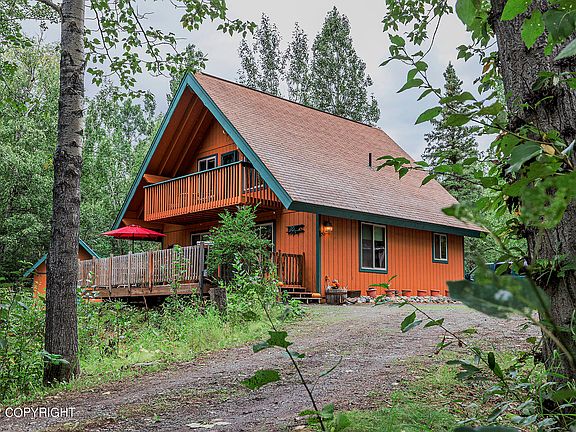This Alaskan home with wood stove is ready for you. The modified A-frame has been completely remodeled with tongue and groove knotty pine throughout! Enjoy a large front deck for entry and entertaining guests. Large wooded and private lot with parking pad for all your Alaskan toys. A 12x12 wired shop and additional shed on property is great for projects and storage.Almost a 5* Energy Home Upgraded with Alaska Energy Rebate Program. Home has high efficiency water heater, furnace, and vinyl clad windows. Upper level has 2 bedrooms newly carpeted, a remodeled full bath with tiled shower and a nice remodeled walk in closet in the guest room with lots of storage options. Off the master bedroom is a large vaulted deck to enjoy morning coffee from your southern exposure view. The main level has an open floor concept with tongue and groove ceiling and accent walls, laminate flooring and a wood stove with stone surround. The living, dining, kitchen, half bath, laundry with stacked front load washer/dryer, and office with a built-in bookshelf exit to a small rear deck and fenced dog area.