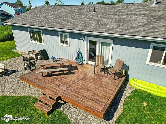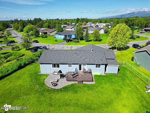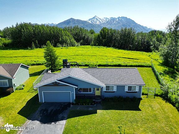 Adorable 3BR/2BA ranch in an established Palmer neighborhood! 1,280 sq ft w/ vaulted ceilings, laundry room, and 2-car garage. Updated interior lighting, refreshed exterior paint with shutters, window boxes, gable accents and landscaping. New back deck & gravel patio (2023). Updated hall bath, new roof (2024). Primary BR with en-suite. Fenced yard with mountain views--shed stays!