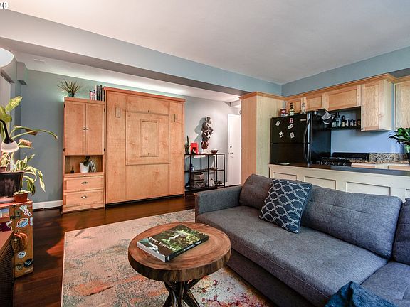 Fabulously efficient, this condo is like an IKEA display! New luxe wood floors, fresh zen paint color, calm treehouse view through huge windows, make it the perfect city retreat. Full kitchen: 4 burner gas stove, fridge, dishwasher, granite counters; full bath with a bathtub and closet. Wall bed has table attachment, large storage closet in unit! New washer/dryer! Convenient to both OHSU campuses & PSU!