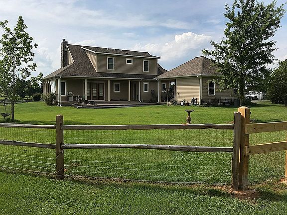 Custom built in 2014, this ranch style 2 story home sits on a hill of 5 acres. The outside features a shingled roof, hardieboard siding, wraparound porch, a large wood deck on the back, one car garage with attached carport and breezeway leading to the side door. The home is energy efficient with a tankless hot water heater and extensive spray foam insulation. We have found the electric bills to be amazingly reasonable considering the hot summers we have been experiencing. Large 8ft french doors and full light windows provide open view to the country setting. Inside you will encounter faux beams in the kitchen, dining and living area which compliment the 10 ft ceilings downstairs and 9 foot upstairs in the loft area where the 2 bedrooms are found. The master bedroom on the first floor has his and her walk in closets, a spacious bathroom complete with a tiled walk in shower, and a spa bath tub. The 2 sinks are Restoration Hardware furniture. Just outside the master bath you can drop your laundry in the washer, use the farm sink for large rinsing and cleaning up after working outdoors. The spacious kitchen is complete with a farm sink, a separate coffee bar and an island containing a gas cooktop and large area for bar seating. The solid wood cabinets all have soft closing doors. There is a beverage cooler on the island, lots of custom lights and under counter lighting and a ceiling fan. Each room has a working ceiling fan. There is extra storage in the closet under the stairs and in the attic space on the south side of the home.The sunroom is an amazing spot for having a brunch! Fireplace is wood burning and can be enjoyed while sitting in the spacious living area. Every clear evening one can enjoy a sunset while sitting on the front porch which faces west. The drive up the hill to the home is tree lined. THE ZILLOW ESTIMATE IS WRONG! IT IS FOR THE 5 acres on the north side that we sold last November. The value given is for the 5 acres without the home that is now owned by a builder who is building a home there. HOA DUES ARE $400 semi-annually. PRIVATE SHOWINGS WEEKEND AFTERNOONS