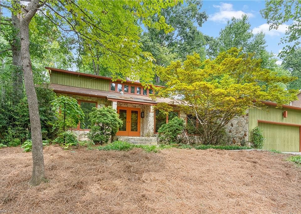 Really cool house channeling Frank Lloyd Wright vibes with an amazing two-story stone fireplace in the large great room that has wood planked vaulted ceilings with beams and a wet bar. New Renewal by Anderson sliding glass doors along the back of the house that lead out to the massive deck. A hard to find two car attached garage with a workshop or storage area off the back. Two good sized bedrooms downstairs, the upstairs is only the Primary suite. A large laundry is on the main level with lots of cabinets and a closet. The kitchen has tons of potential! Nature lovers delight with lots of different plants (several Japanese Maple trees) Water heater new in 2022. Roof 2016. Walk to Bicentennial and Bog gardens. Close to Friendly center shopping and dining. Come check this unique home out today!