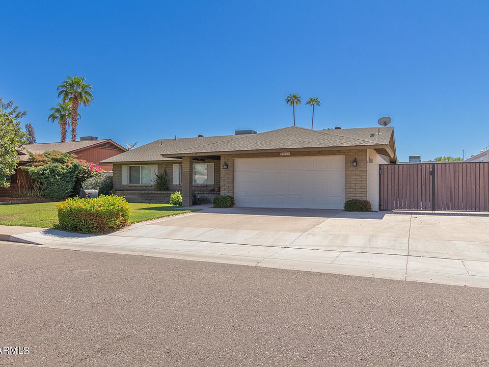 Gorgeous single-level, slump block home with no HOA in a fantastic Chandler location. Great curb appeal with a lush grass front and extended driveway with an RV gate for parking your toys. Enter the home with a tile and wood laminate throughout. Light and bright with a sunken living room and family room that is a great room off the kitchen. The kitchen has ample storage with a granite counter, tile backsplash, stainless appliances and a pass-through window to the backyard. The backyard is a desert oasis with an extended covered patio with multiple fans, a built-in barbeque with an island and a diving pool with a built-in spa. Don't forget the all-weather pergola with pavers, built-in shed, and cement slab for RV parking. The primary bedroom has a wall of closets and an ensuite upgraded