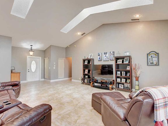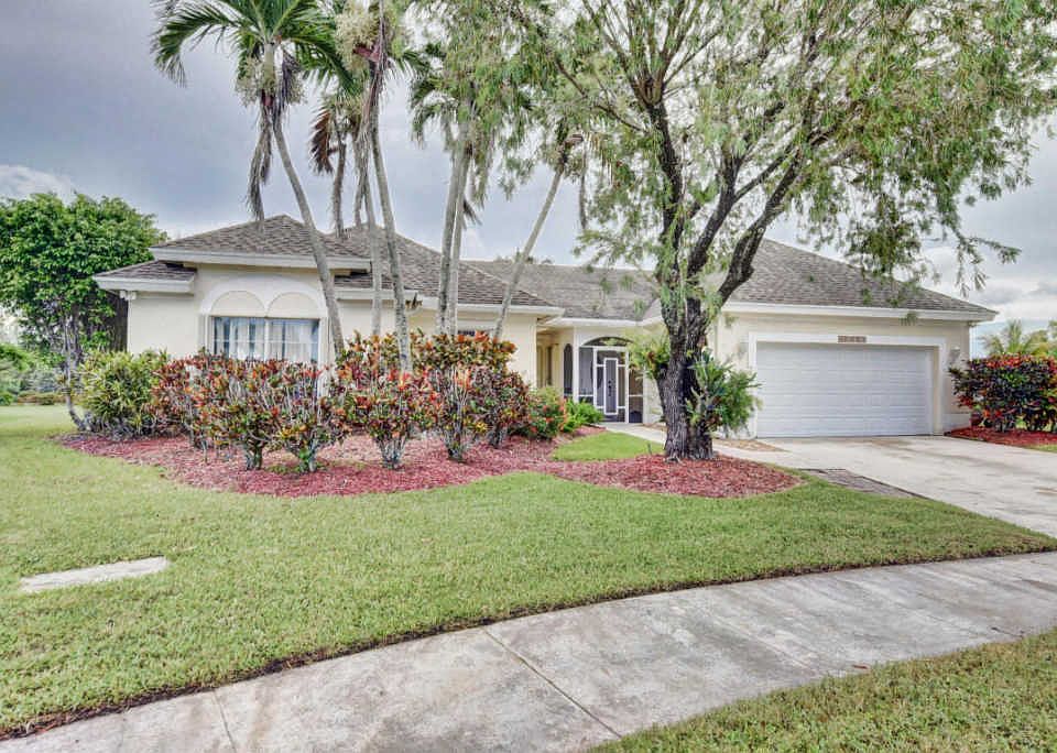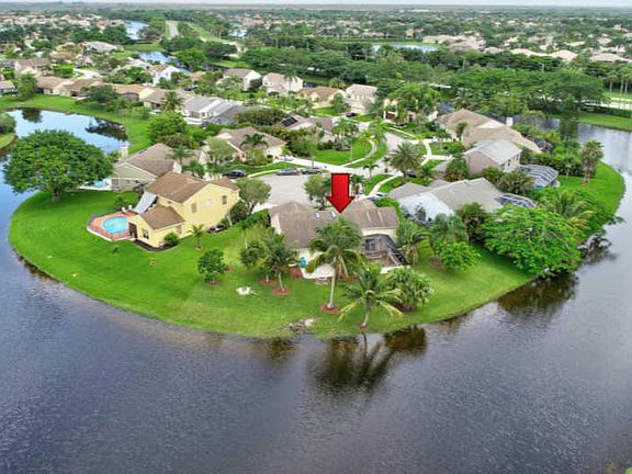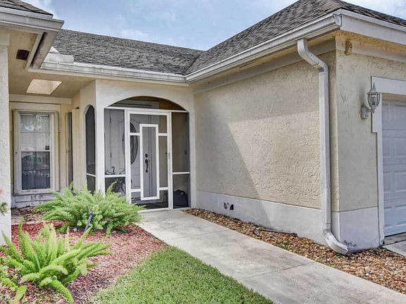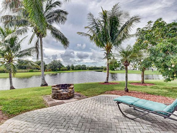 Beautiful 4 bedroom cul-de-sac home with amazing water views. This stunning home sits on over a 1/4 acre lot. Enter into a dramatic open sun lit living room with two skylights. Looking out at tropical foliage. Many types of fruit trees, tranquil lake with no rear neighbors. Granite top kitchen, Accordion Shutters, hurricane front door, garage door and generator hook up. Newer 24'' tile floors, water feeds off lake. Roof 2005. Open spacious floor plan, screened patio.Walk or bike to 3 'A' rated schools. Low HOA. Must see!