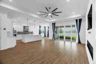 Electric fireplaceQuartz countertopOversized center kitchen islandGourmet kitchenWood-grain custom closet organizationWood plank tile flooringCustom-screened patio