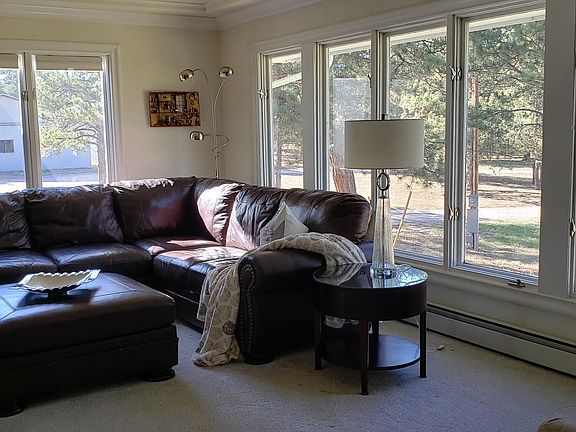 Fully furnished, gorgeous, custom built modern farmhouse on 18 acres in the Black Forest. This stunning horse property is equipped with everything a traveler could need and is tastefully decorated. It features 3 bedrooms all with comfy queen size beds and great storage. The 820 sqft master retreat has stunning hardwood floors, oversized walk in closet, private balcony and all granite his and her bathrooms. This home has both a roomy living room and a fabulous great room equipped with a gas fireplace, built in desk and dining area. There is a seperate dining room and the huge kitchen features a refrigerator, double convection ovens, trash compactor, microwave/convection oven, dishwasher, 5 burner cooktop, granite coyntertops, a baking center with a built in Kitchenaide mixer and prep sink. The kitchen is equipped with a toaster oven, coffeemaker, crockpot, disposal, cookware, dishware, utensils, serveware, glassware, silverware and basic staples. Home furnishings include 2 all leather couch sets, side tables, farmhouse dining table for 10 and large screen smart TVs. The house is also equipped with a washer, dryer and central vacuum system. All utilities are included with a flat $500 fee along with fiberoptic high speed internet and TV. This home has a hyhydronic heat system, private well, on demand hot water, garage parking and beautiful vistas amoung the ponderosa pine trees. The property is located in Falcon, close to Peterson and Schriever AFBs and the Air Force Academy. Easy commute to grocery stores, shopping, restaurants and district 49 schools. Property is perfect for a military family in between duty stations, those building a home or new to Colorado Springs needing housing prior to purchasing a home. All utilities are included for a flat monthly fee of $500. Utilities include electric, propane, water, sewer, trash, fiberoptic internet, television, and phone.
