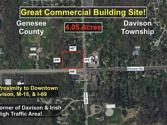 Great Commercial Building Site! Ideal Location in Davison on the Northwest corner of Irish and Davison Rd. Just minutes from downtown Davison, M-15, and I-69! Don't miss out on your Dream Property!
