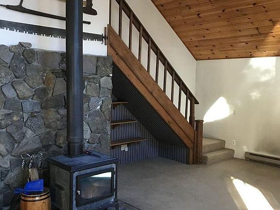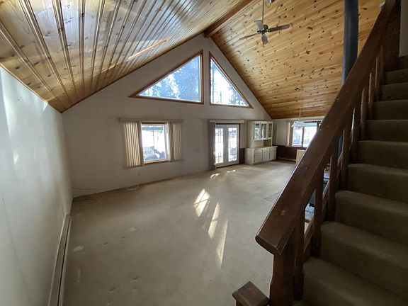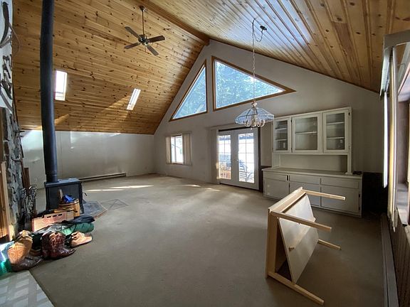 Chalet in a wooded setting just minutes from town. This home would make a great weekend get away or full time residence. Open floor plan living and dining areas have floor to ceiling views. Area for garden, chickens or small livestock.