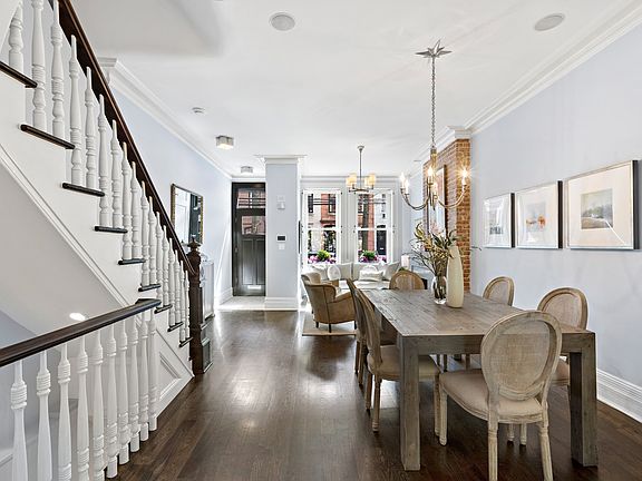 Located on one of Hoboken's loveliest tree-lined blocks this three-window-wide brownstone townhome sits on a 16'x100' lot with four bedrooms, four and one half baths over four floors with a three floor extension. Entering the parlor floor you are struck by the inviting open floor plan and volume created with the high ceilings as well as the warmth of the original turn of the century features including exposed brick, original restored newel post, mahogany bannister and cove plaster molding that are expertly integrated with the modern upgrades of the home. The formal seating area features a gas fireplace with a slate mantel and exposed brick and is adjacent to a generously sized dining area that leads to a wonderful gourmet kitchen with custom kitchen cabinets and an abundance of built-in storage. The gourmet appliances include a Bertazzoni chef's five burner range, GE Monogram wall ovens, Bosch refrigerator and dishwasher and an oversized wine refrigerator. The kitchen is anchored with a large island with marble counters and back splash. There is a powder room off of the kitchen and the rear of the home encompasses a large media room with custom built-in cabinetry and bookshelves. The entire back wall of the media room has large French doors that fill the home with light and provides seamless access to the Ipe deck and professionally landscaped garden with bluestone pavers and a wonderful European Hornbeam flanked by two separate seating areas. The second floor houses the primary suite which features a wall of built- in storage and an ensuite bathroom with a double vanity, floor to ceiling designer tile and heated floors, and across the hall is a large walk-in closet. Also on this floor is a large second bedroom with an ensuite bathroom with floor to ceiling tile and heated floors. The top floor of the home has two more bedrooms: one with a custom built-in office and a wall of exposed brick and another large bedroom and full bath featuring exposed brick and large apron sink vanity. The garden level provides a separate entrance and has been completely renovated. This large open area has ample room for a living/TV area, a full bathroom in marble, a wet bar with sink and a large storage and mechanical room. 1206 Bloomfield adds all the conveniences of modern living such as two zones of HVAC, a Navien on demand hot water heater, Marvin windows, built-in speakers with Sonos - throughout basement, backyard, first floor and master suite, security with alarm including HiK Connect - video monitoring outside front and back of home, Wemo - wireless controlled lighting on first floor, wireless thermostats, central vac and a new roof in 2020. 1206 Bloomfield is located in the heart of the uptown Hoboken brownstone district and is conveniently located only five minutes from Hoboken's 14th Street NY Waterway Ferry and two short blocks from Washington Street's boutique shopping, restaurants and the NJ Transit bus route which will take you to Port Authority bus terminal in approximately fifteen minutes. Rental parking available nearby.