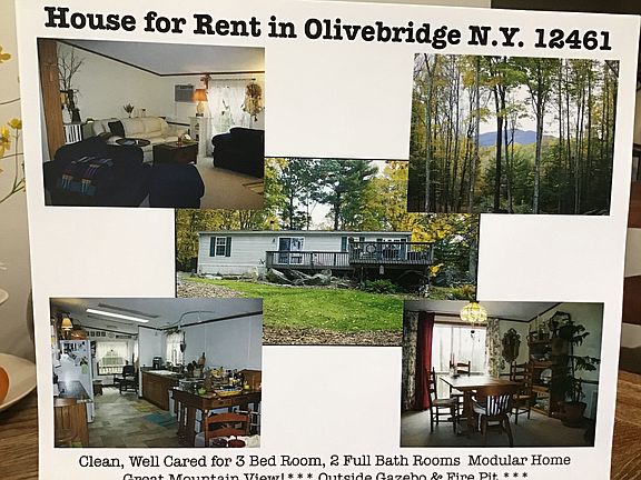 Well cared for 3 bedroom 2 full bathroom modular home ~ great Mountain View! ~ nice size deck. Big kitchen with breakfast nook ~ dining room ~ $2200. a month plus all utilities plus references and security a must! Looking for tenants who will appreciate this well cared for home and keep it the same. No, smoking ~ no pets ~ no smoking! Large yard outside fire pit, walking trails tenant responsible for mowing lawn and outside yard maintenance. Close to Shokan rail trails 25 minutes to Kingston. Tenant is responsible for all utilities, lawn mowing, and fall leaf cleanup ~