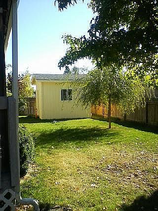 It is a comfortable house. NEW PAINT ON THE OUTSIDE 9/10/17. Kitchen has been updated with corian counter tops and a laminated floor, and a ceiling fan. Good appliances. Baths have nice counter tops, laminated floors, ceiling heat lamps, windows and exhaust fans . Master has dual sinks in a corian top. Ceiling fans cool the house until the a/c has to be turned on. Laundry room is next to garage, has a door, and far away from the living room. Garage is finished. There is an on-site built shed. A large covered deck is a step outside the sliding glass door in the kitchen. Everything works. Trees in backyard. Front door faces NW. Afternoon sun in backyard..House is clean and well maintained. View of hills out front window. House faces NE and has a screen/storm door on front.