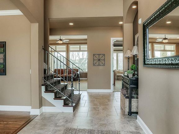 Here is your opportunity to own a former Street of Dreams home! With over 5,600 fin. sq. ft. this 1.5 story is breathtaking! The beautiful family room features a stone fireplace and leads to the expansive kitchen. A chef's dream with high-end JennAir appliances, granite counters, huge island with fridge drawers & W/I pantry. Through the wetbar area is the lovely formal dining room. Also on the main is the primary suite and its spa-like bath with heated floors, 2 person whirlpool tub and steam shower. The 2nd floor features 3 bedrooms, 2 baths, a media room, huge laundry room & a flex space with a built-desk. Fun times await in the walk-out lower level that boasts a large rec room, stone FP, projector TV & surround sound, a 12ft. circular sunken bar, office with heated tile floors & built-ins and an exercise room with rubber flooring that leads to the storm shelter. The 4 car garage has hot/cold water & a floor drain. The list of stunning features doesn't stop there. Hurry on this one!