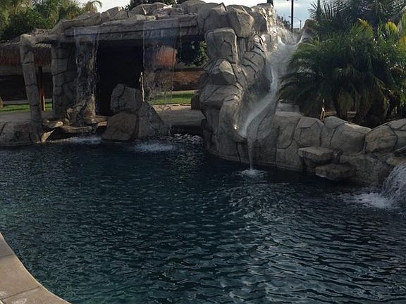 This is an Entertainment Dream Home which features 5 bedrooms, 4 1/2 baths. Large, comfortable Living Room with 6 glass french doors which opens up to the incredible pool entertainment area. Off the Living Room is the kitchen which features all Kitchen Aid appliances, granite counters, pantry and elegant cabinetry. The great room/family room with a fireplace off the kitchen with the dining area make this the heart of the house. A large enclosed laundry room with granite counter top & sink . The master bedroom is large, and has a large walk-in closet as well as a bathroom that is large enough for two! A beautiful fireplace for a cozy night, as well as a Private entry French doors open up to the incredible beach front pool & jacuzzi. The garage fits 4 cars, has a polished floor and has over sized doors. The out door entertainment area is incredible: features 4 Pilapa's, an outdoor cooking Cabana, pebble tech pool with spectacular lighting features, pebble beach entry for the safety of younger swimmers, a grotto area with swim up seating, water slide, with beautiful water falls, bar area just off the grotto area, has fire pit ring & seating area, a pebble tech spa, stage area as well as an out door speaker system, sandy area for Volleyball, fruit trees, fenced area for a corral/stable and RV parking strip with dumping portal which is large enough for two RV's. The home is in a beautiful upscale area, close to freeways & shopping. The lot is flat and usable and is an Entertainment Paradise! All personal items are excluded from the sale. Travertine flooring, Venetian smooth walls & recently painted. This is a smart house. Including thermostats, front & back smart locks, surveillance, Tv, stereo suround system through out the home. Garage doors. Turnkey