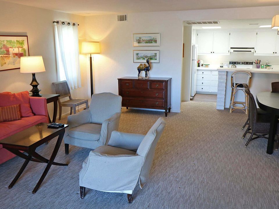 Please note that the 2-Bedroom is now Rented. The neighboring #A is a very large fully-furnished 1-Bedroom: huge open Living, Dining and Kitchen (perfect for entertaining), with huge Bedroom, four closets and large Bathroom (double vanity with tub/shower). Off the bedroom is a sitting deck looking out over the palm trees of Indian Springs, and Off the Living space is a HUGE outside deck with BBQ, table for dining, and views out over the western mountains. And you can't ask for a more central location: walk to markets, cafe's, shops and spa's. Call me about this Unit, but also several other Houses that are available in Calistoga... Happy to show them to you!! Ron Hartman, Sotheby's Int'l. Realty, Cal-DRE #01128106 (Photos shown here are of both the 1-Bedroom and the 2-Bedroom Units: almost identical in appearance and finishes). Flexible on Term (minimum 30 days). Plus Utilities or Utility Fee. Parking Spot included.