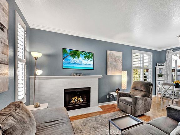 BACK ON THE MARKET! This beautiful home is a great opportunity to own a place in coveted Fountain Valley. Located in the gated New Chase complex between the pool area and the cascading fountains, this convenient downstairs home boasts a prime location. Enter to an entry hall and go left to the great room, an open space to relax or entertain. The elegant living room area is nestled around a white brick fireplace and enhanced by nicely textured ceilings, crown molding, and plantation shutters. A bar separates the kitchen, which has an abundance of cabinets, an electric range, microwave, dishwasher, refrigerator, and is illuminated by recessed lighting. The dining area opens to a cozy covered patio, a great place to chill with a book or a friend on a nice day. If you take the entry hall to the right you encounter a small bedroom or den, the laundry closet with a stackable washer & dryer, and the primary bedroom. The primary bedroom offers a vanity with a sink, a walk in closet, and access to the jack and jill bathroom and patio. Additional features include dual paned windows, laminate and luxury vinyl flooring, central air conditioning, and a storage closet on the patio. New Chase offers its residents an inviting pool and spa area and lots of visitor parking. You have to see to appreciate this gem of a home.