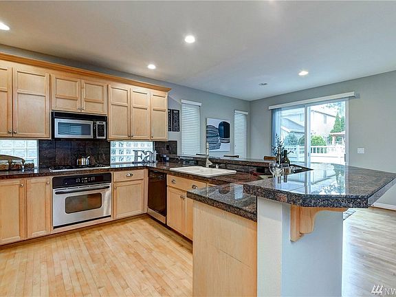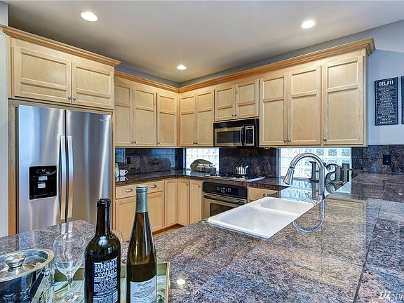 Charming New England style Buchan resale in sought after Harbour Pointe Village 2 Story home. Enter the grand entryway with soaring ceilings & skylight flooded with natural light. Great room concept with gourmet kitchen offering granite counters, stainless steel appliances, granite backsplash & breakfast bar, eating area & family room with custom shelving & cozy gas fireplace. Hardwoods lead to living room & formal dining room or office. New carpet & interior paint throughout. French doors lead to huge master bedroom with 5 piece ensuite & walk-in closet. 2 additional bedrooms with den & full bath. 2 car attached garage. Walking distance to highly rated Mukilteo Elementary, Middle & High schools, walking trail, golf course shops & eateries.