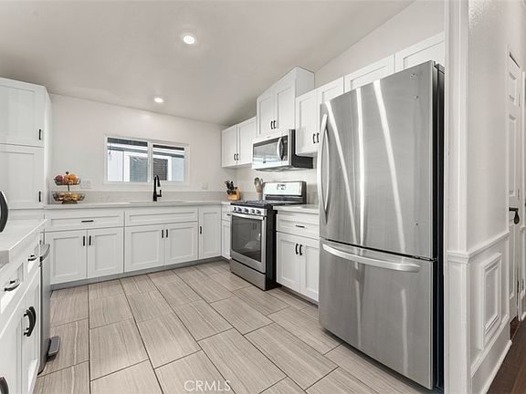 This Move-in Ready unit at La Fontaine mobile home park features a completely remodeled gourmet kitchen, boasting quartz countertops, chef-inspired sink and faucet, slow closing drawers and cabinets, recesses lighting and custom tile flooring. The living room, dining room and hallway, all offer fresh new paint, crown molding and hardwood-like flooring. All three bedrooms are well proportioned with the principal bedroom offering mirrored dual closets and private en suite bathroom. Hall bathroom has recently been updated with new showing tiling and fixtures, all new vanity, light fixtures, and flooring. This home has a fresh new coat of paint on the exterior. Walking distance to retail shopping like Walmart and Northgate Market! Conveniently close to Centennial Park and libraries with freeways access only five minutes away. This is not a Senior community and All Ages are welcome!