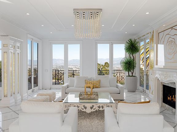 Welcome to The Crystal House. Behind a stunning backdrop of impressive panoramas, this Beverly Hills Post Office estate surely shines. In 'The Summit', a prestigious 24-hour guard gated community, this Modern abode is fittingly placed at the end of Crest Court. The custom residence has been meticulously curated and remodeled to meet the highest of standards. Through a gorgeous courtyard and around a custom fountain, you are immediately greeted by expansive views. Spread with regal lighting, a commissioned Christopher Guy chandelier, custom Bisazza mosaics, and Porcelanosa-wall tiles, every inch of this crystal home has been hand-selected sparring no expense. The main level boasts a sumptuous formal dining, living, family room, movie theater, and entertainment room with a wine cellar and bar. Stone countertops, a custom-lit center island, and appliances from Subzero, Wolf, and Miele fill the large dream kitchen and breakfast room on the main level, all with panoramic views. Upstairs, the primary suite with a large personal walk-in closet and fireplace in the sitting area offers the perfect perspective, while more en-suite bedrooms and a home office finish the top level. On the lower level, your indoor/outdoor abode comes to life with an upgraded sauna, gym, and leisure room that leads to the saltwater view pool, spa, two fire pits, built-in BBQ, and large multi-level entertainment decks. Located just minutes between Beverly Hills, the Valley, and the beach. With a 3-car garage, elevator, and spread of designer finishings, The Crystal House creates a truly luxurious 90210 experience. Whether entranced by the perfectly manicured landscaping, jaw-dropping views, or terraced hillside dawning fruit, living here is sincerely exceptional.