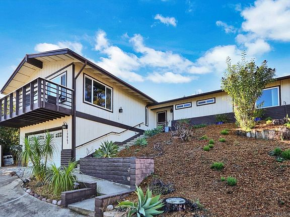 Resort-like hillside home with heated pool and spa. Amazing views on a quiet, private, no outlet street with great neighbors. Away from the noise, but just minutes from convenient shopping and access to recreation at local lakes and hiking trails. Underground utilities make for an amazing 180 degree view overlooking Winter Gardens and Eucalyptus Hills to Iron Mountain and Mount Woodson. Large parking pad for 3 cars plus boat/rv parking at street level with water spigot. Upgraded kitchen with custom cabinets, granite counters and all stainless steel appliances. Bathrooms include a new low flush toilet, all new brushed nickel faucets and matching cabinet handles, as well as new shower diverters. Entry, hall and large dining room feature hand hewned wood plank looking ceramic tile for a luxurious look with durability. Huge living room with wood/gas fireplace has solid exposed beam and incredible sunset views, with access to the large balcony offering even more views and a peaceful escape for morning coffee, watching local hawks and other wildlife or star gazing at night. Outside, the pool and spa have all new equipment, including programmable variable speed pump, gas heater and filter unit, as well as a Dolphin robotic pool cleaner, remote controlled multi-colored pool light and new pool tools. The backyard is fully fenced with separate dog run on side. There is a multipurpose storage/workshop/pool house with extended patio cover to finish as you see fit. New smart 8-zone sprinkler controller and valves. Fully owned solar w/ smart inverter results in near zero electric bills. Central heat and air conditioning with a new smart thermostat, plus a whole house fan and an automatic attic fan keep the house comfortable throughout the year, plus the large living room ceiling fan with remote and ceiling fans with lights in every bedroom provide added comfort. All windows are dual-paned and energy efficient, providing added cost savings, comfort and quiet. Full-sized newer front loading washer with steam and electric dryer also convey, along with a new (stil in unopened box) hybrid (heat pump/element) water heater, that requires a new dedicated electrical connection. Other new items include a smart video doorbell, carbon monoxide detector, designer switches with dining room dimmer, motion activated hall, stairway and kitchen under-cabinet lights. Motion activated security lights at the garage, stairs and front door. Solar lights in the front planter and along the driveway. Low maintenance, mostly succulent, landscaping with low water demand. This amazing property is move-in ready with opportunities to make finishing touches at your leisure. Priced below market, sellers are motivated to sacrifice it as they downsize.