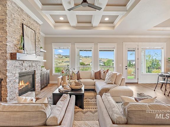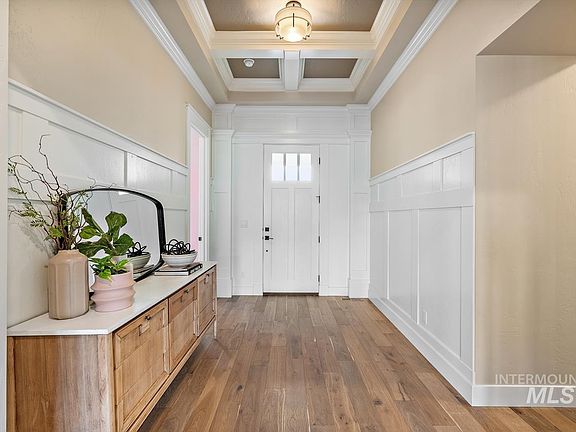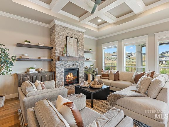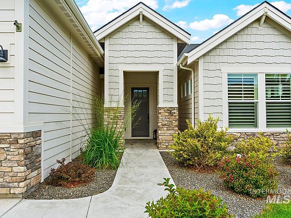 Stunning custom-built home, nestled in the Boise foothills of Cartwright Ranch. This remarkable single-level residence offers 4 bedrooms, 3.5 bathrooms, dual primary suites, an upstairs bonus room, foothill views, and 2,984 square feet. Situated on a premier lot, this home enjoys no neighbors at front or rear of the property and borders nature trails and a lush green park! Luxury meets comfort and function in this open-concept layout with soaring 10-foot ceilings. Gourmet kitchen equipped with high-end Thermador and Bosch appliances, quartz counters, tile backsplash, butler’s pantry, gorgeous ceiling high cabinetry with crown molding, farmhouse sink, and an oversized island. Two primary suites, offering flexibility for a mother-in-law suite or luxury home office. The fully fenced backyard offers a spacious entertaining area, with picturesque rolling hill views and privacy. Cartwright Ranch offers access to 810+ acres of open space, community pool, clubhouse, fitness center, and pickleball court.