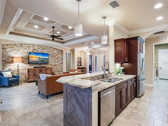 - Interior Features: Ceiling Fans(s), Eating Space In Kitchen, High Ceiling(s), Master Bedroom Downstairs, Open Floorplan, Stone Counters, Walk-In Closet(s), Crown Molding, Solid Wood Cabinets, Thermostat, Living Room/Dining Room Combo, Window Treatments, Tray Ceiling(s), Coffered Ceiling(s)