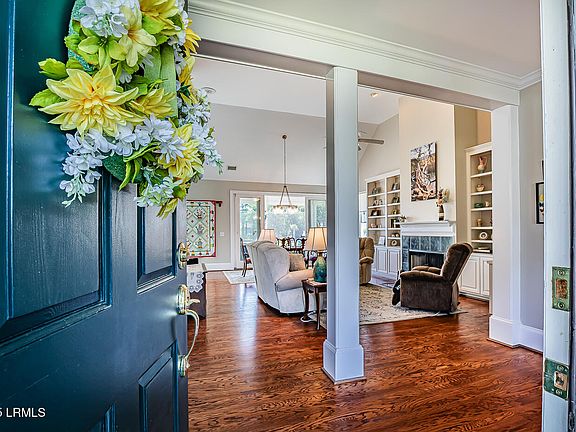Gorgeous Golf & Lake Views in a Prime Location on Dataw Island! Nestled in a peaceful cul-de-sac with sweeping views of the Morgan River Golf Course and Big Dataw Lake, this stunning one-story Lowcountry home is a rare opportunity! From the paver driveway to the welcoming front porch, you'll immediately feel at home. Step inside to discover an open-concept layout with soaring ceilings, hardwood floors, and a spacious great room anchored by a gas fireplace and custom built-ins. The dining area sits beside glass doors that frame picturesque views perfect for meals with a backdrop of nature. The kitchen offers abundant cabinetry, bar seating, and opens to a cozy family room, creating an ideal space for gathering. The primary suite is a true retreat featuring cathedral ceilings with beams, expansive windows showcasing the breathtaking scenery, private deck access, a huge walk-in closet, and a luxurious en-suite bath with dual vanities, soaking tub, and walk-in shower. Two additional bedrooms provide comfort for guests or family, with one offering direct access to the rear deck. Enjoy coastal living year-round on the screened porch or entertain on the adjacent brand-new open deck ideal for dining al fresco or grilling with a view. Additional highlights include a two-car garage plus a dedicated golf cart garage. Located near the marina and surrounded by Dataw's natural beauty, this home offers the best of island life. Dataw Island is a private, gated community featuring award-winning amenities, golf courses, tennis, pickleball, dining, fitness, and a full-service marina. Membership in the Dataw Island Club is required. Come experience the serenity and elegance of life on Dataw this view-filled gem won't last long!