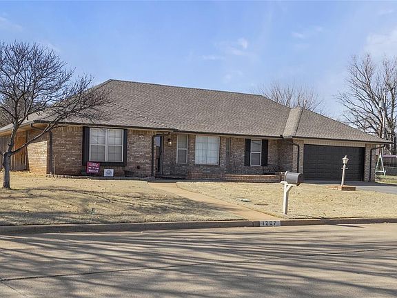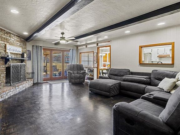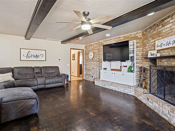 Located in the popular Grandview Addition with mature trees and wide streets, this spacious 4 Bedroom / 3 Bath home features 2,377 sq. ft. of living space plus an additional 144 sq. ft unfinished basement / storm shelter that is accessed from the garage. The Den with wood flooring, beamed ceiling, and wood burning brick fireplace also features a built-in entertainment center. Kitchen / Dining features built in stainless oven, stainless dishwasher, with light & bright painted white cabinets and ceramic tile flooring. 2nd Living Room is flex space and could be utilized as 5th Bedroom / playroom. The oversized Owner's suite features double closets (one is a large walk-in) with open bath vanity & linen storage. All Bedrooms are large with great storage. Bedroom 4 & Bath 3 are secluded and both located off of the Kitchen area toward back of home. Nice sized covered patio looks out onto the HUGE backyard. Plenty of room for a pool, and lots of room for the kids & pets to run and play. Call for your private tour today.