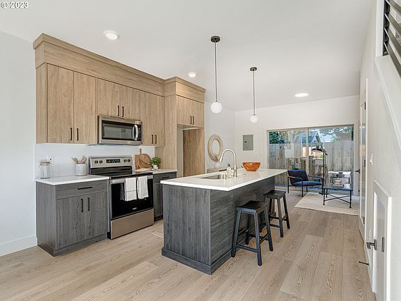 No money down - 100% financing options available! Exquisite modern architecture + elevated designs are showcased in the impeccable 2 bed + coveted 2.1 bath unit with phenomenal 97bikescore + proximity to the ever vibrant Kenton neighborhood! Thoughtfully designed, enjoy designer touches throughout this light+bright home including high-end features, lofty ceilings + neutral tones! With an open concept plan, quality can be seen with a custom kitchen boasting an expansive island with eat-bar, slab counters + SS appliances! Spacious living area with large windows grace the lower level with a door to the individually fenced patio/yard space. An outstanding opportunity to own vs renting with amazing quality + peace of mind plus a 1-year Builder Warranty + AC! (List price is subject to the buyer qualifying for the Portland Housing Bureau - System Development Charge exemption program to promote affordable housing in Portland, call for more info.)